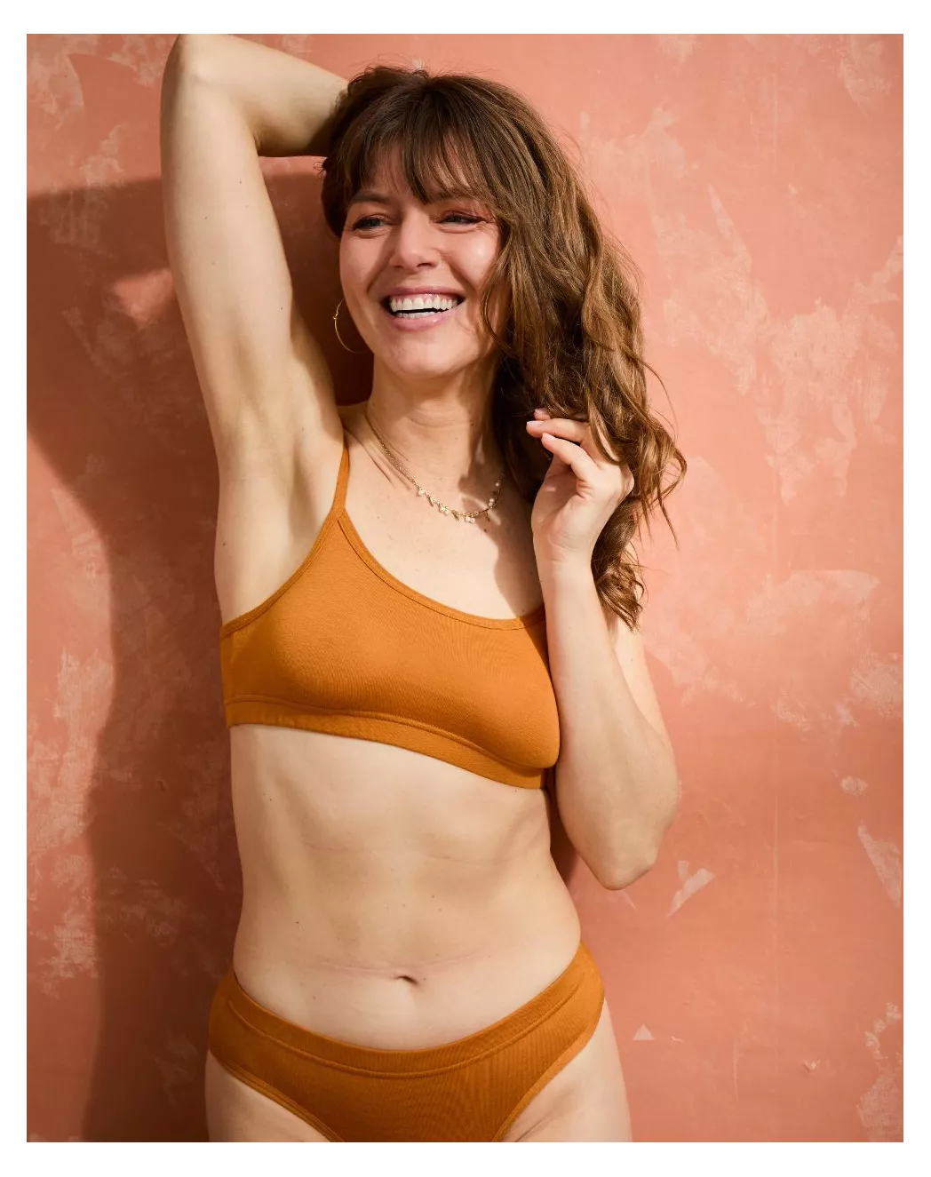 Un ensemble qui illumine la silhouette avec subtilité. Dans cette version mordorée, le coton modal se teinte d’éclat et de chaleur. La brassière réglable épouse le buste avec une souplesse enveloppante, tandis que le col dégagé dessine une ligne délicate et féminine. La culotte, à la coupe parfaitement ajustée, vient compléter le tout avec confort et allure. Un duo doux et lumineux, pensé pour conjuguer confort du quotidien et beauté naturelle, à porter comme une seconde peau dorée.