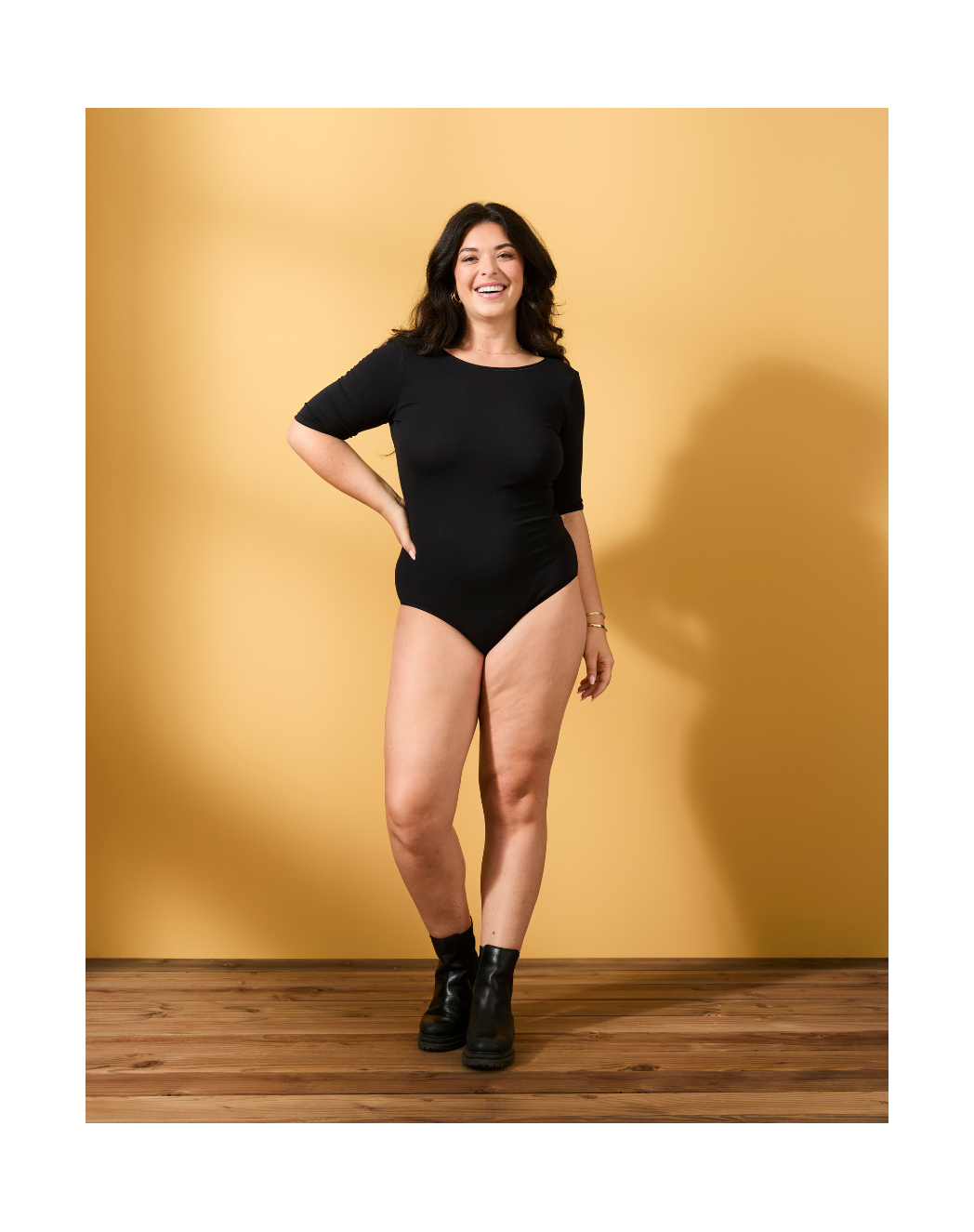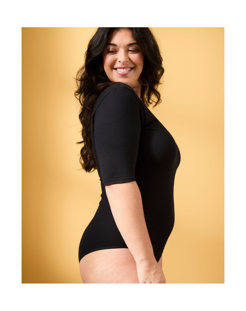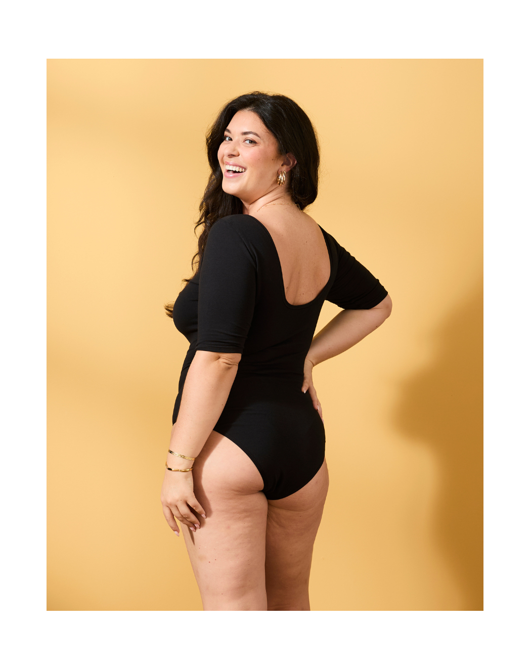 Le body Sarah joue sur le contraste entre une encolure devant près du cou et une encolure danseuse profonde au dos, pensé pour le sublimer. L'ajout des 3% d'élasthanne dans ce jersey de coton permet une coupe ajustée qui maintient et sculpte la silhouette tout en garantissant une liberté de mouvement totale. Une pièce pensée comme un basique minimaliste, qui dévoile toute sa dimension sensuelle une fois le dos révélé.