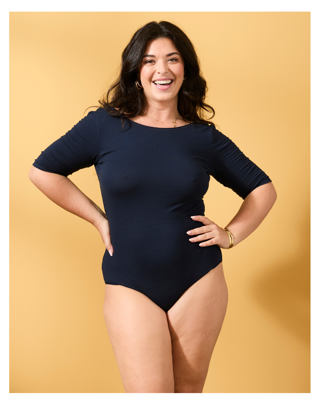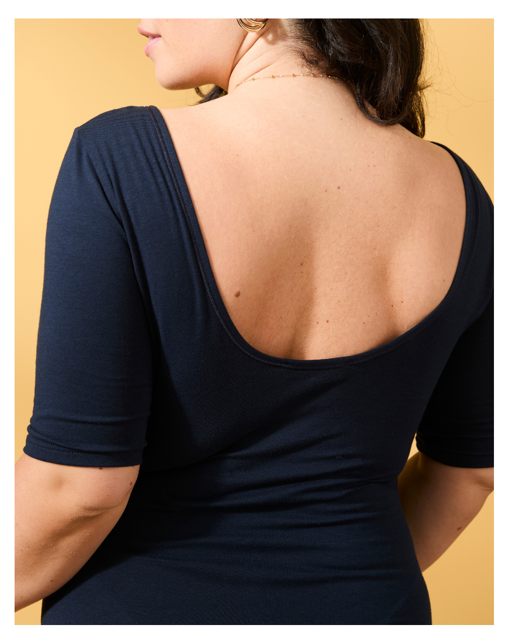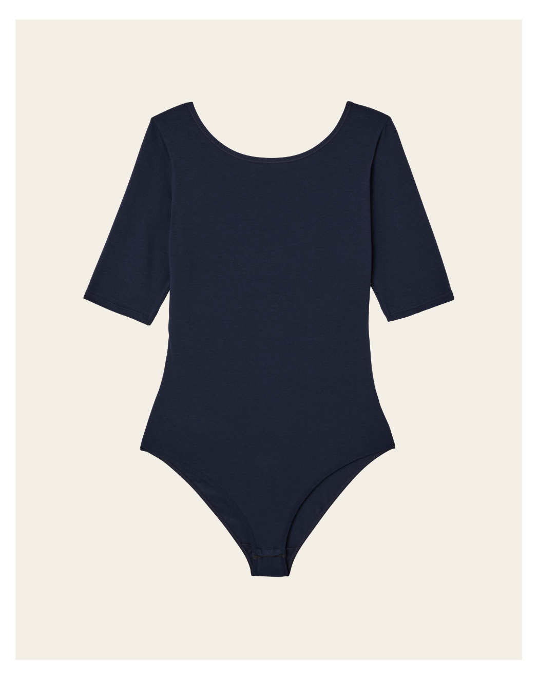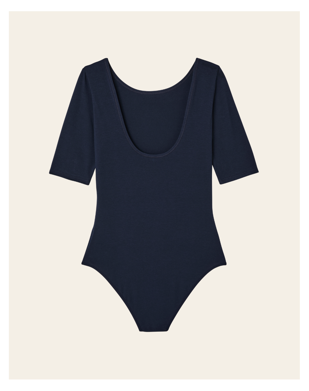 Le body Sarah joue sur le contraste entre une encolure devant près du cou et une encolure danseuse profonde au dos, pensé pour le sublimer. L'ajout des 3% d'élasthanne dans ce jersey de coton permet une coupe ajustée qui maintient et sculpte la silhouette tout en garantissant une liberté de mouvement totale. Une pièce pensée comme un basique minimaliste, qui dévoile toute sa dimension sensuelle une fois le dos révélé.