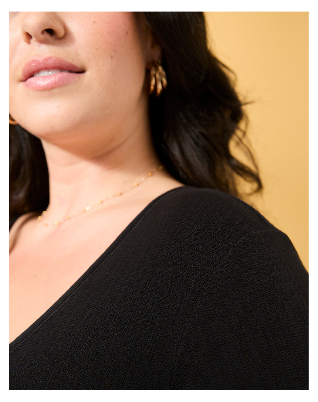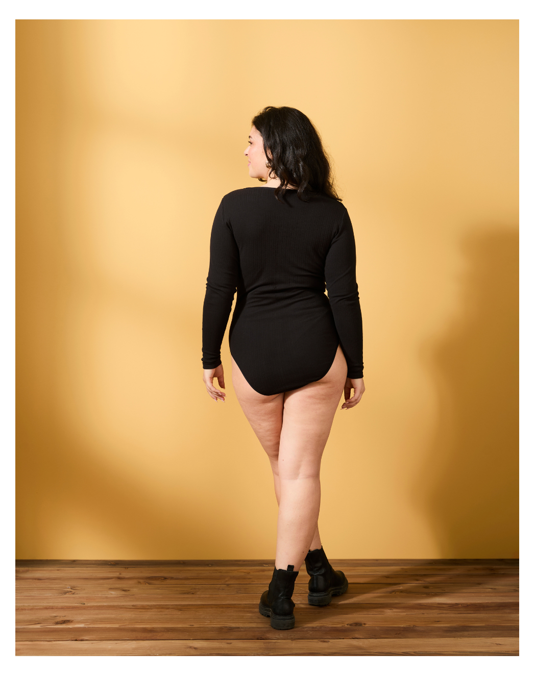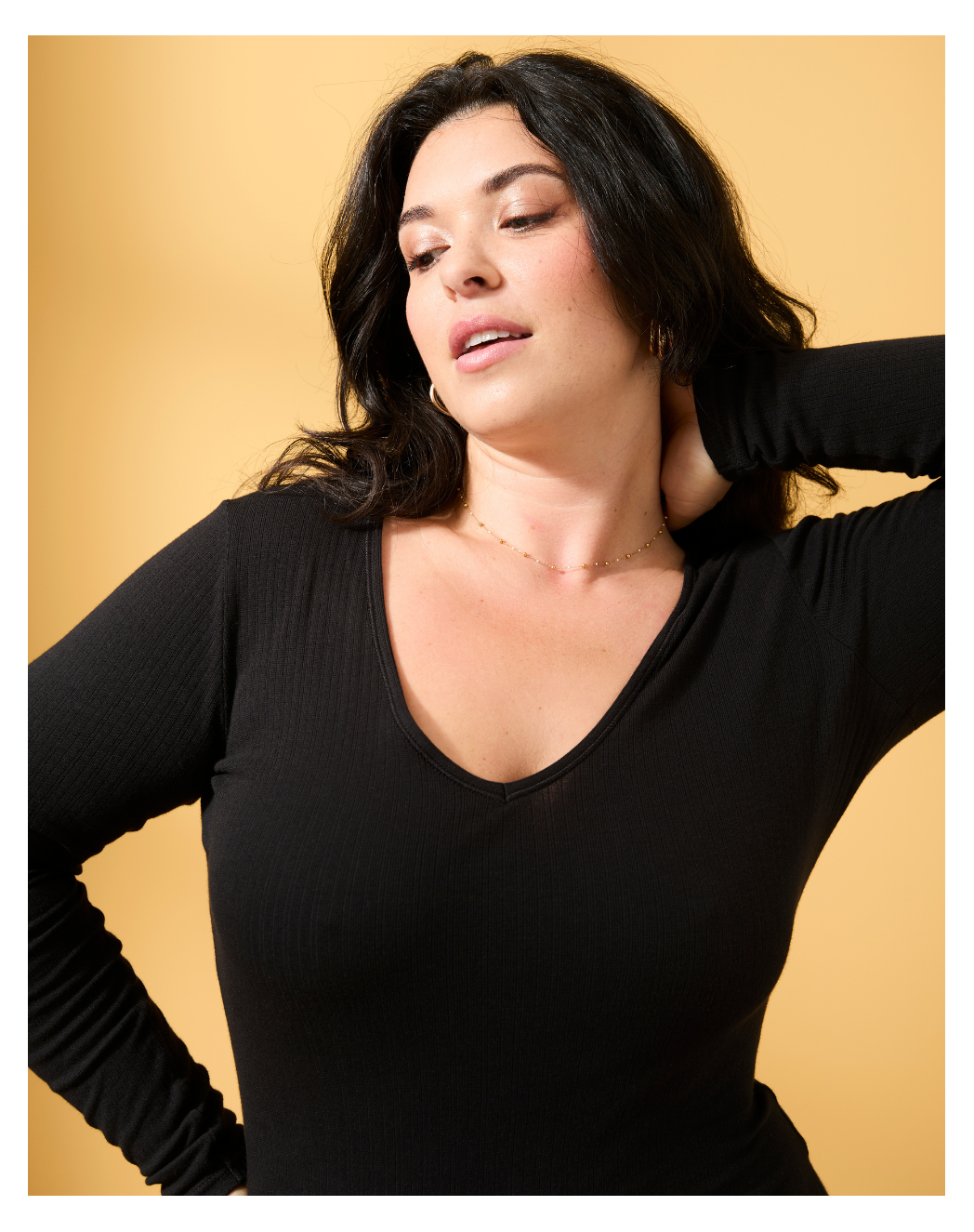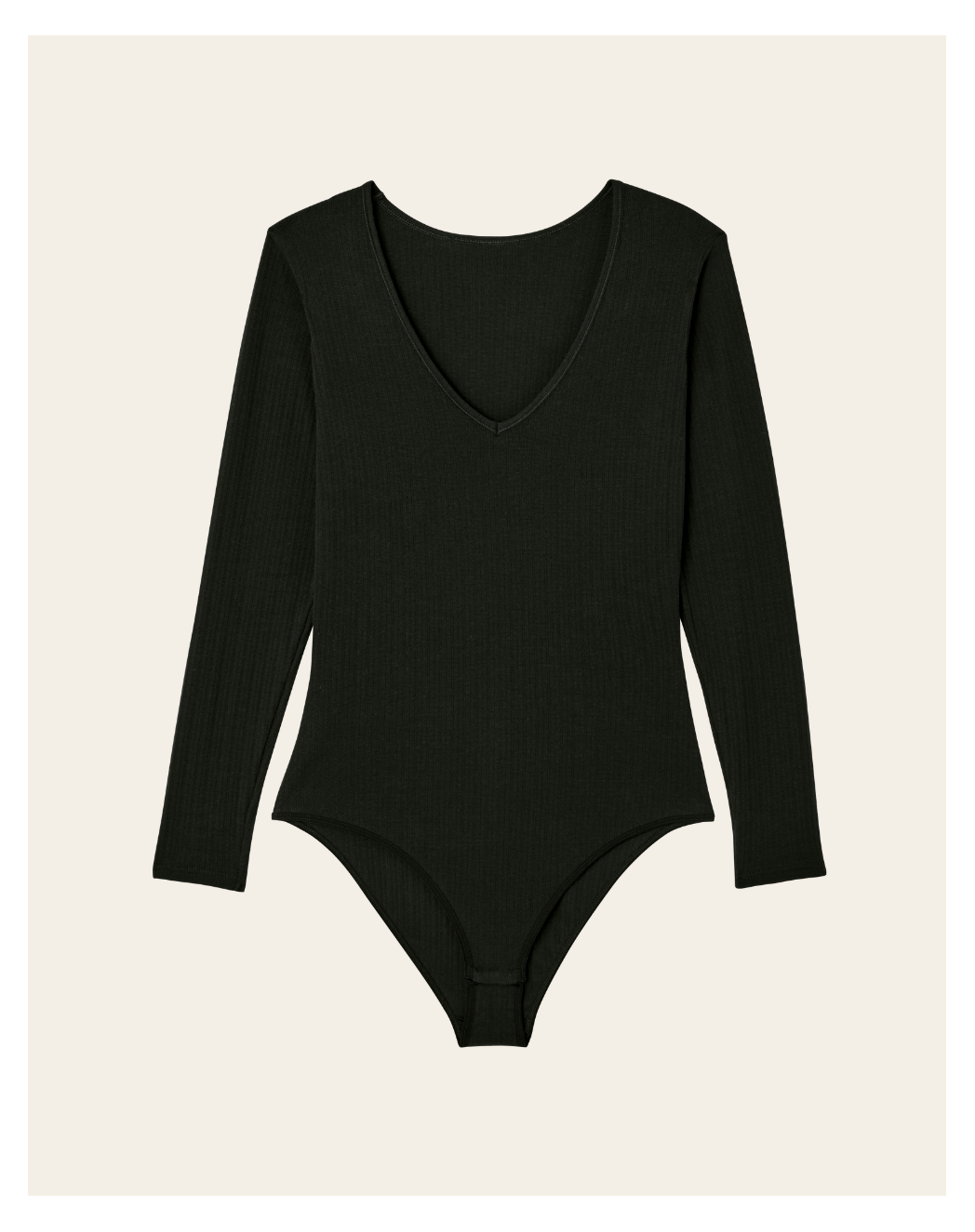 Le body Garance est revisité en version manches longues, toujours aussi élégante, enveloppante et structurée. Sa maille côtelée de 200g apporte du maintien et un joli tombé, tout en restant douce sur la peau. L’encolure en V sublime le décolleté et ouvre joliment la poitrine sans trop en dévoiler. Facile à associer, on l’adore porté seul avec un jean taille haute pour un look affirmé ou glissé sous une veste ou un gilet pour une silhouette plus cosy et travaillée. Une pièce moderne et féminine, pensée pour vous accompagner en toute saison, du matin jusqu’au soir.