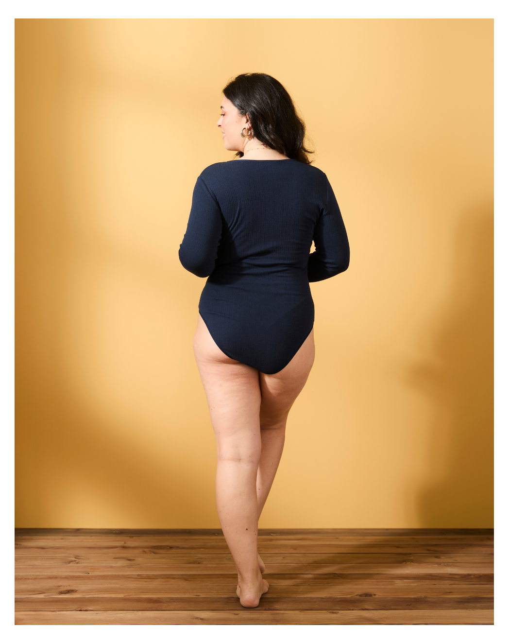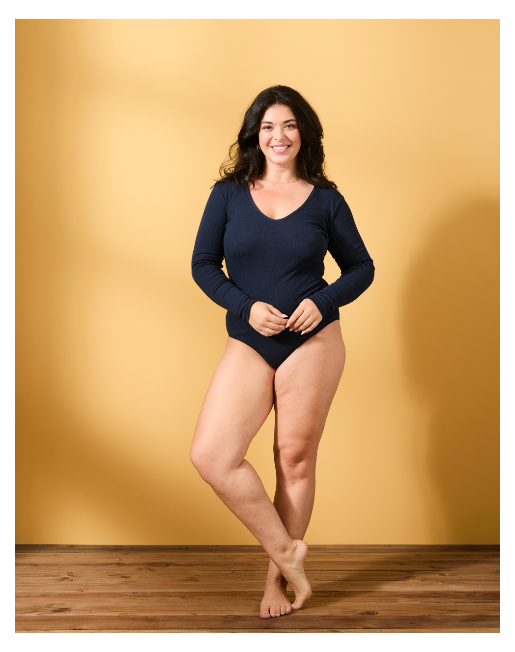 Le body Garance est revisité en version manches longues, toujours aussi élégante, enveloppante et structurée. Sa maille côtelée de 200g apporte du maintien et un joli tombé, tout en restant douce sur la peau. L’encolure en V sublime le décolleté et ouvre joliment la poitrine sans trop en dévoiler. Facile à associer, on l’adore porté seul avec un jean taille haute pour un look affirmé ou glissé sous une veste ou un gilet pour une silhouette plus cosy et travaillée. Une pièce moderne et féminine, pensée pour vous accompagner en toute saison, du matin jusqu’au soir.