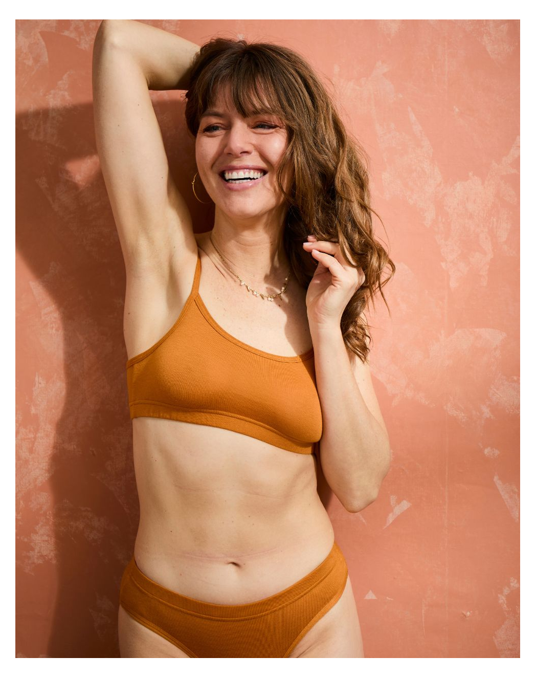 Un ensemble qui illumine la silhouette avec subtilité. Dans cette version mordorée, le coton modal se teinte d’éclat et de chaleur. La brassière réglable épouse le buste avec une souplesse enveloppante, tandis que le col dégagé dessine une ligne délicate et féminine. La culotte, à la coupe parfaitement ajustée, vient compléter le tout avec confort et allure. Un duo doux et lumineux, pensé pour conjuguer confort du quotidien et beauté naturelle, à porter comme une seconde peau dorée.