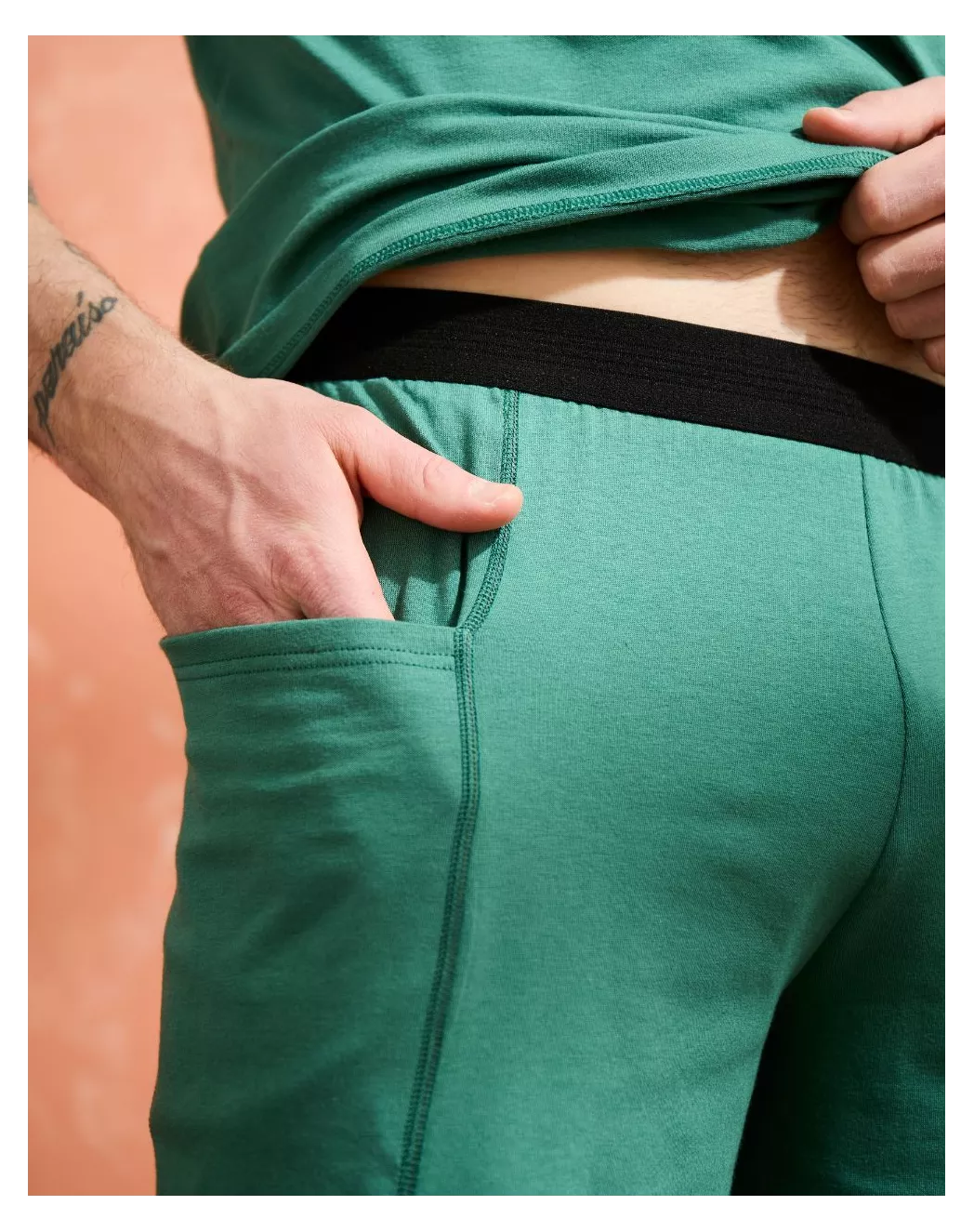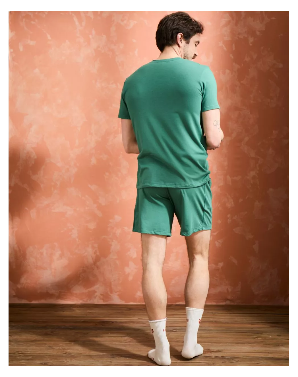Hector se décline en vert anglais, un coloris profond et élégant qui apporte une touche sophistiquée à ce duo casual. Le t-shirt col rond s’associe à un short confortable, rehaussé de poches discrètes et d’une ceinture noire contrastée qui structure la tenue avec justesse. Le tout dans un jersey de coton modal au toucher soyeux, fluide et respirant. Un ensemble pensé pour les moments de détente, à la maison comme en week-end, où le confort rencontre le style, tout naturellement.