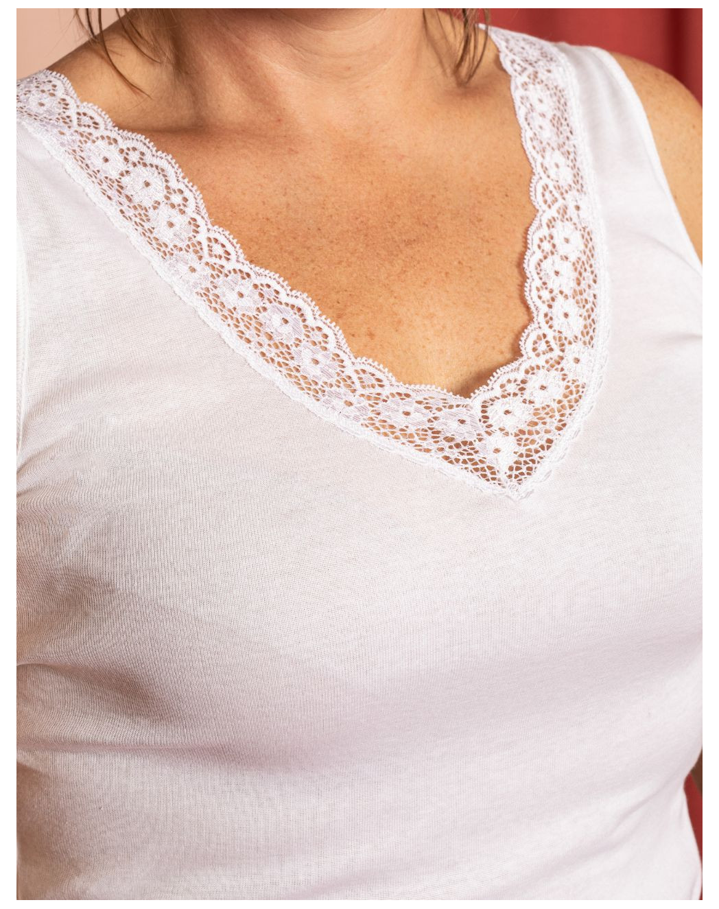 Avec sa dentelle dans l'encolure, ce débardeur vous accompagne lorsque les premières températures frâiches arrivent. Doux, léger et confort il est idéal sous vos pulls.