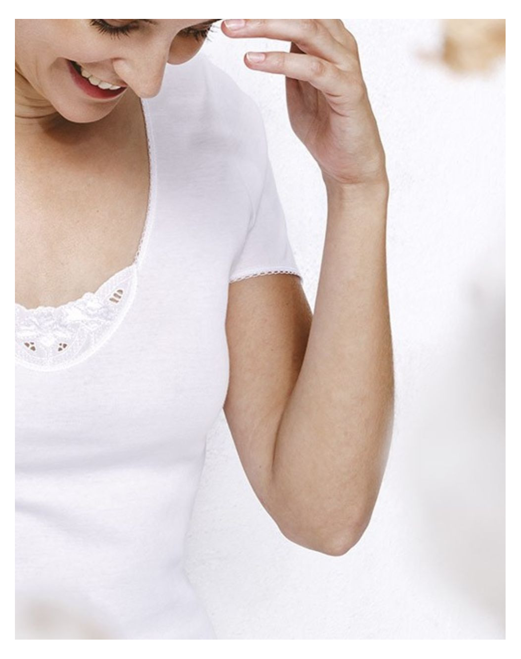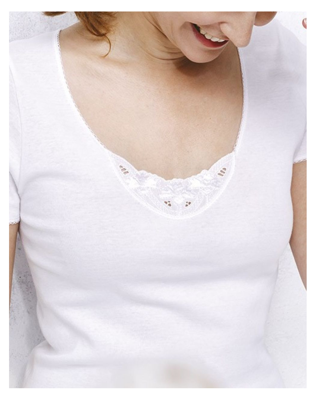 Ce t-shirt manche courte s'adapte à vos besoins, il se porte seul ou sous votre pull en maillot de corps. Il est très féminin grâce à son décolleté doté d'un empiècement broderie.