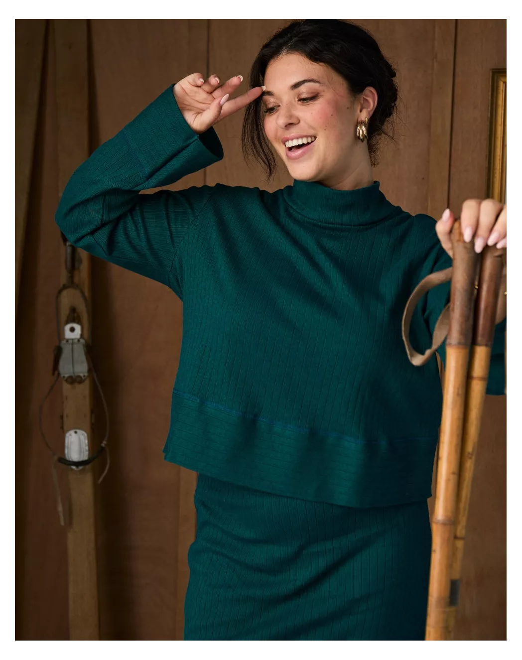 Dans cette teinte verte profonde, l’ensemble Ella révèle une nouvelle intensité. Le top ample, en laine-coton, flotte sur la peau avec douceur, tandis que la jupe en maille côtelée vient dessiner une silhouette subtilement structurée. Le vert cyprès lui confère une allure apaisante et moderne, comme un souffle de nature dans le vestiaire d’hiver. Une tenue enveloppante, confortable et pleine de caractère, à enfiler sans réfléchir, et à ne plus quitter.