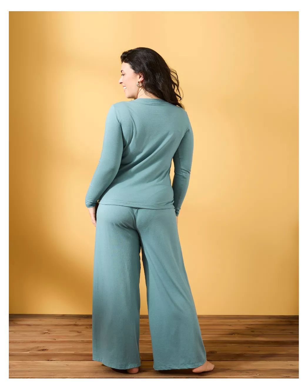 Le t-shirt manches longues épouse la silhouette avec douceur, juste ce qu’il faut de souplesse pour oublier qu’on le porte. Le pantalon large tombe avec fluidité, effleurant la peau comme un souffle chaud. En coton modal 100%, cet ensemble conjugue confort absolu, chaleur légère et élégance décontractée. Son coloris givré, tendre et apaisant, invite au cocooning… tout en gardant une allure impeccable.