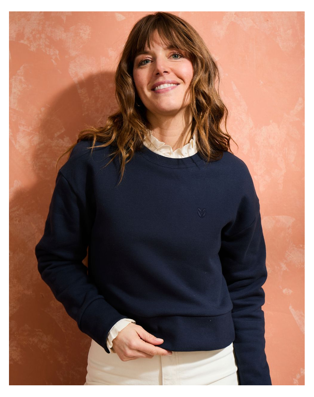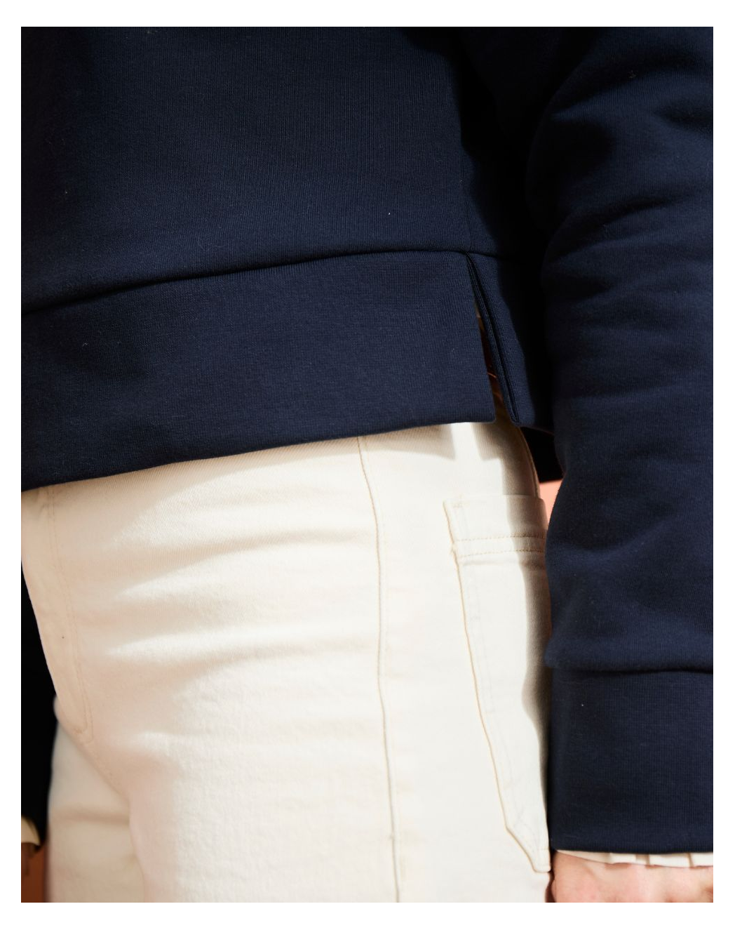 Le sweat Romy réinvente le confort avec une coupe courte et des fentes latérales, apportant une touche de modernité à son allure. Son molleton gratté à l’intérieur enveloppe la peau d’une douceur réconfortante, parfait pour les journées où l’on cherche à allier style et bien-être. Son bord-côte 100% coton en finition 1x1 assure un maintien naturel, sans élasthanne, pour une tenue impeccable qui suit vos mouvements. Discrète, mais essentielle, la broderie signature vient signer ce modèle, pensé pour sublimer le quotidien avec élégance et décontraction.