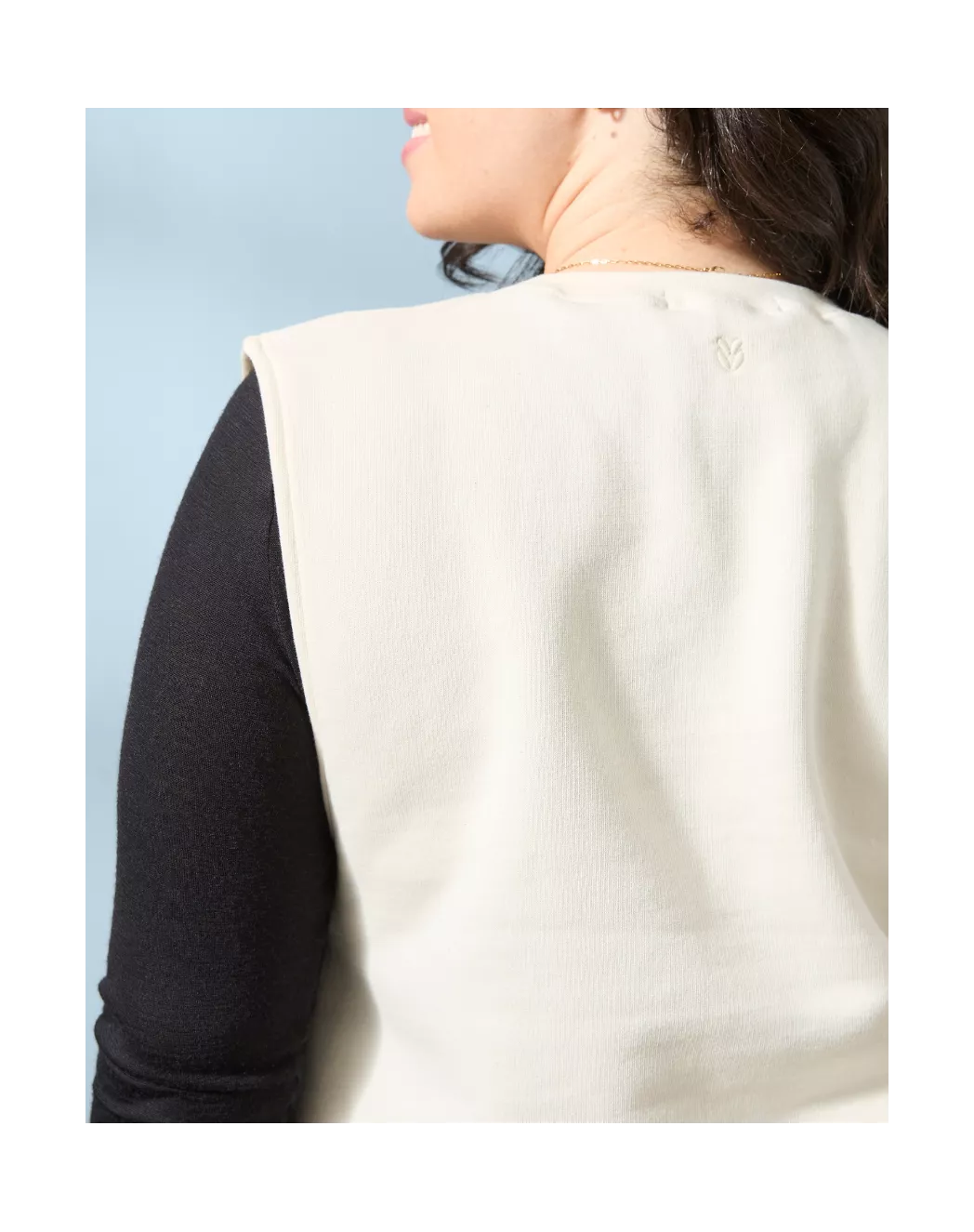 Ce sweat sans manches a été pensé comme une pièce de superposition, grâce à ses larges emmanchures qui permettent de le porter facilement sur des chemises ou t-shirts. Confectionné en molleton 280 g dense et moelleux, il conjugue confort thermique, structure et douceur. Le pli unique sur le côté crée un volume élégant et souligne la taille sans la contraindre. La broderie minimaliste au dos apporte une signature subtile de notre ADN. Un modèle audacieux, qui explore de nouvelles proportions tout en gardant une allure moderne. Le conseil de notre styliste : ajoutez une broche sur le pli pour twister la pièce et affirmer votre look avec une touche ultra-personnelle.