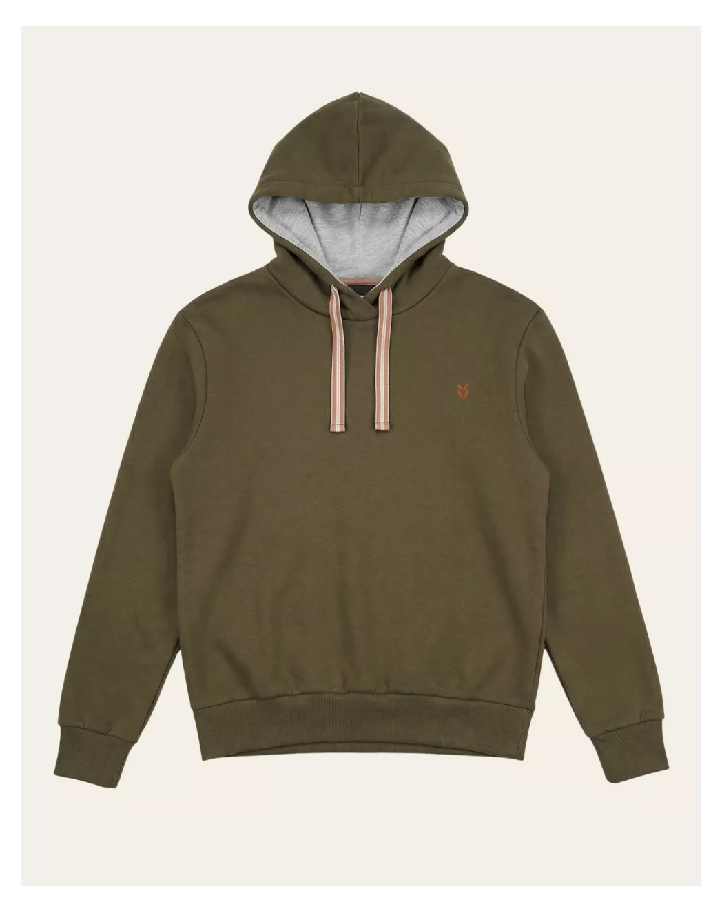 Bord-côte aux manches pour un maintien parfait, broderie poitrine subtile, cordon contrasté rayé, capuche avec couture milieu dos et col croisé pour une tenue structurée et durable.