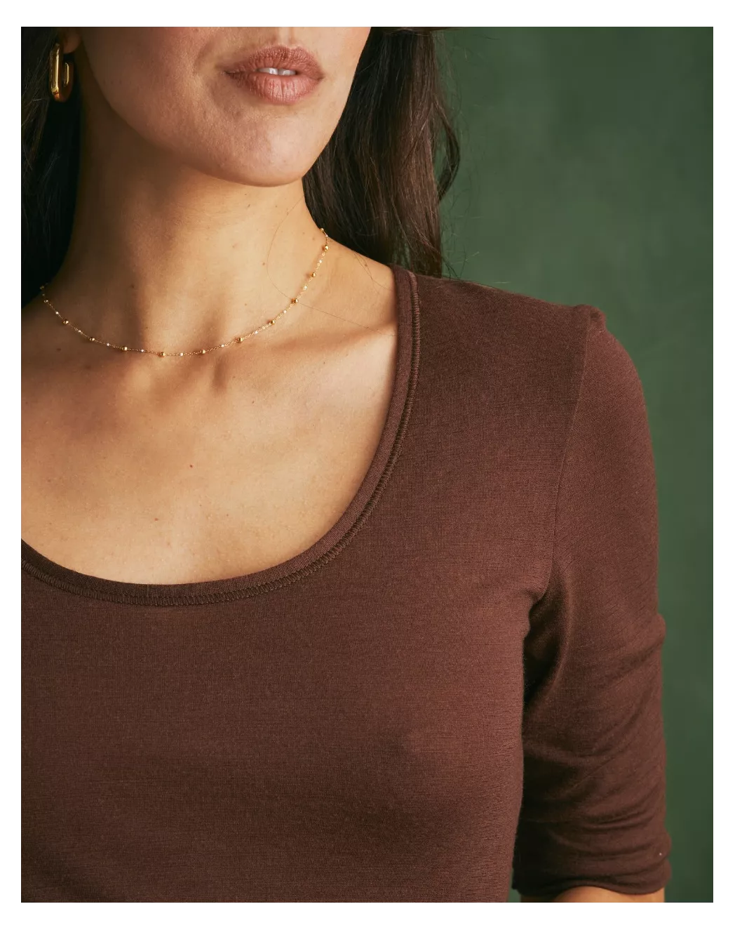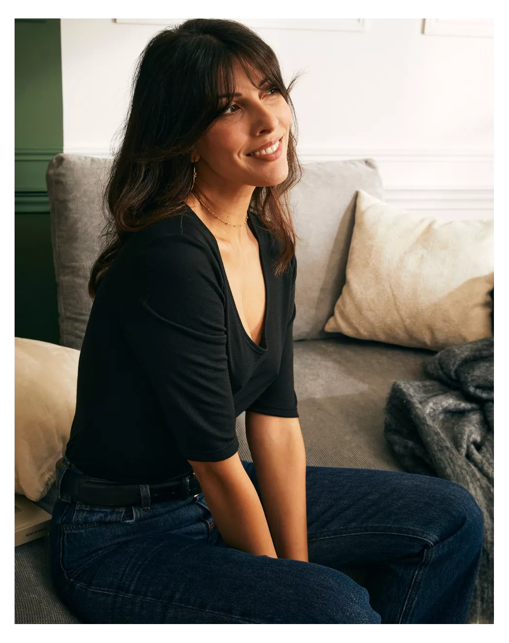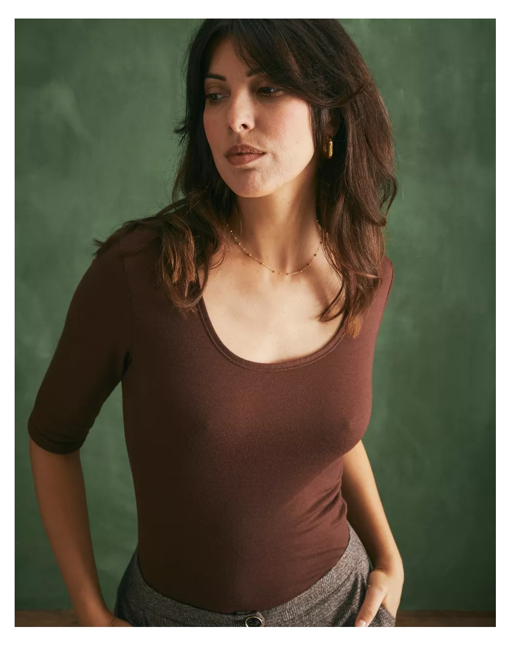 Le top Ellen se joue des contrastes entre élégance et confort, tricoté en 100% laine mérinos, il offre une douceur enveloppante et une chaleur naturelle, tout en restant respirant et léger sur la peau. Son décolleté flatteur et ses manches trois-quarts apportent une féminité subtile, idéale pour porter Ellen seule ou en superposition sous une veste ou un pull plus ample. Le lot chocolat et noir conjugue chaleur et sobriété : le chocolat se fait doux et enveloppant, tandis que le noir affirme une allure élégante et versatile. Pensé pour durer et accompagner tous les moments de la journée, Ellen est ce top que l’on porte avec aisance et style, en toute saison.