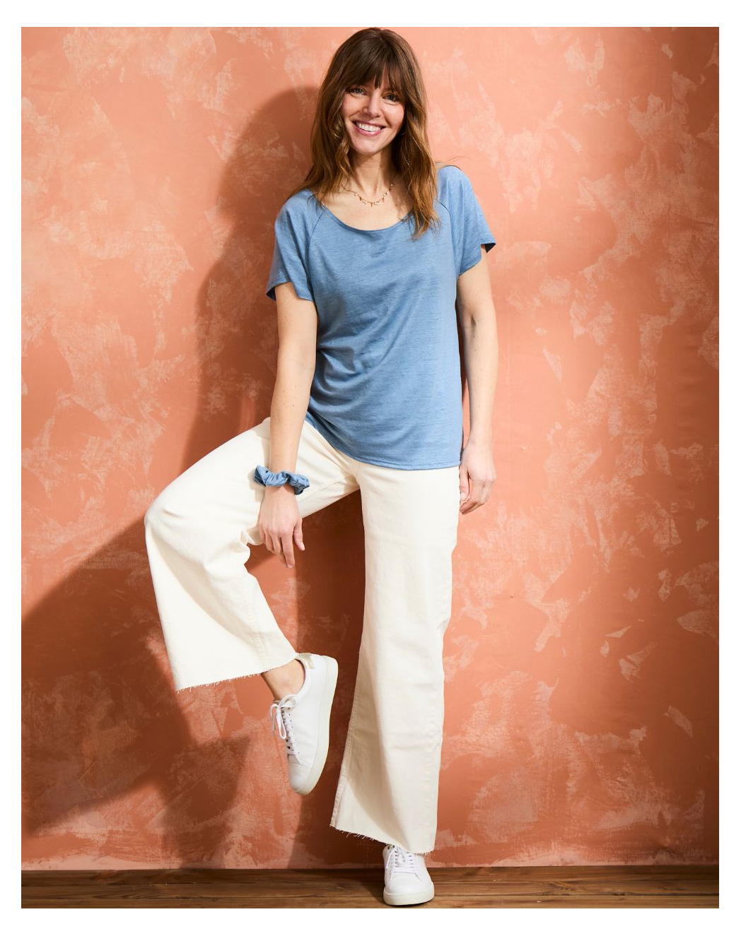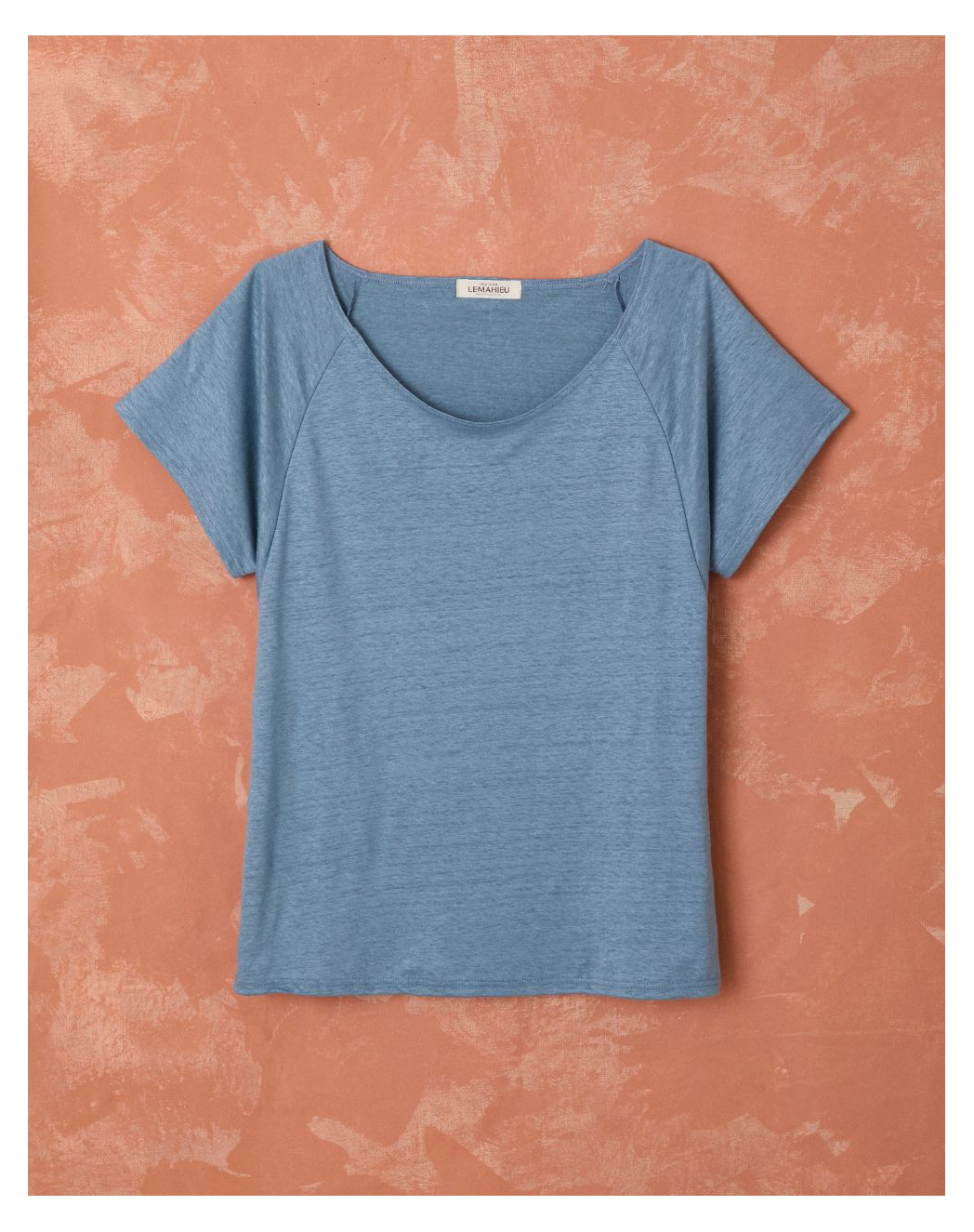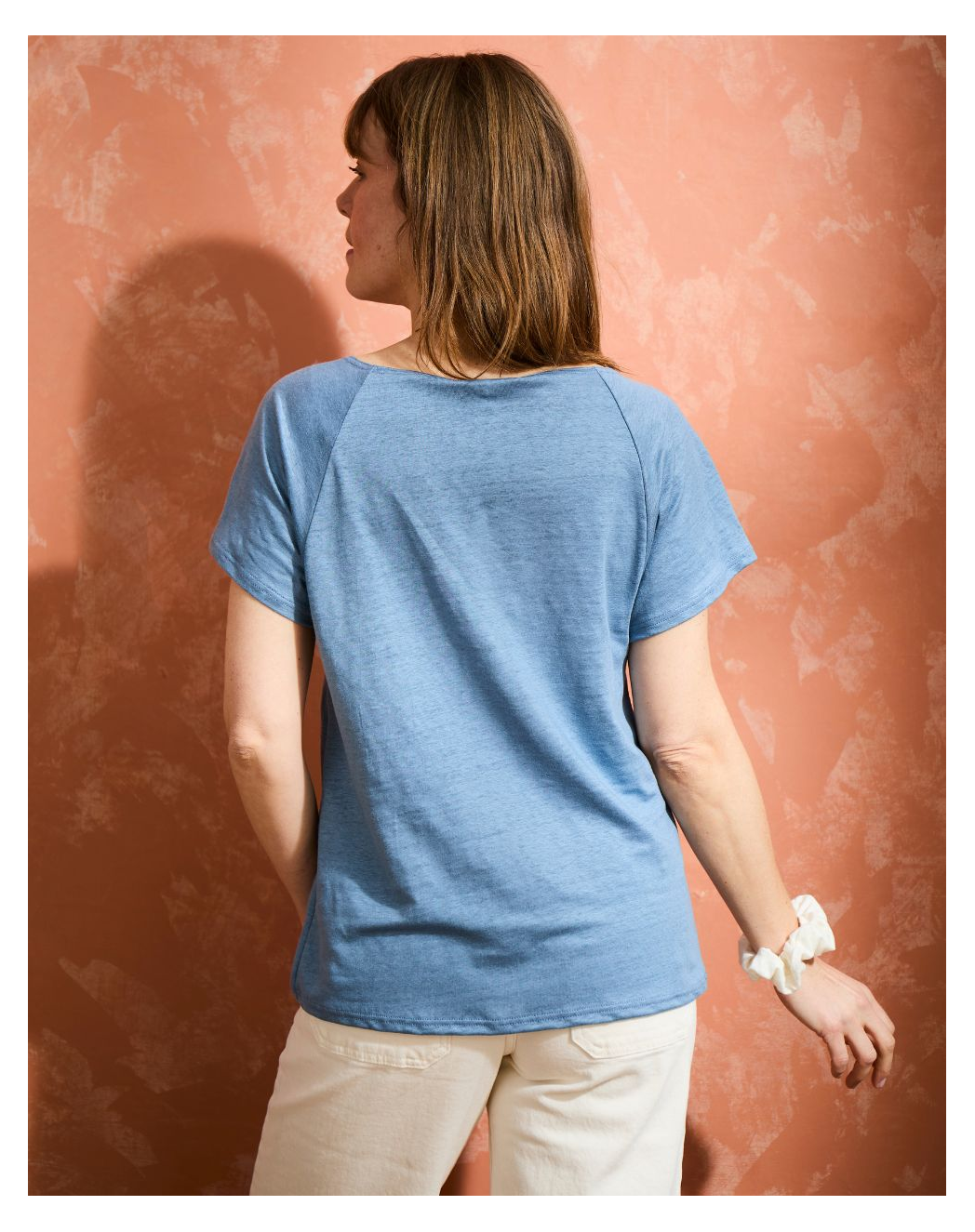 Ce t-shirt en lin, à la coupe fluide et au col rond subtilement décolleté, joue sur l’équilibre parfait entre décontraction et féminité. Son jersey de lin épais offre une tenue impeccable tout en restant léger et respirant. Dans une nuance bleuet, délicate et lumineuse, il apporte une touche de fraîcheur et de douceur au vestiaire. Une pièce intemporelle, pensée pour accompagner chaque saison avec élégance