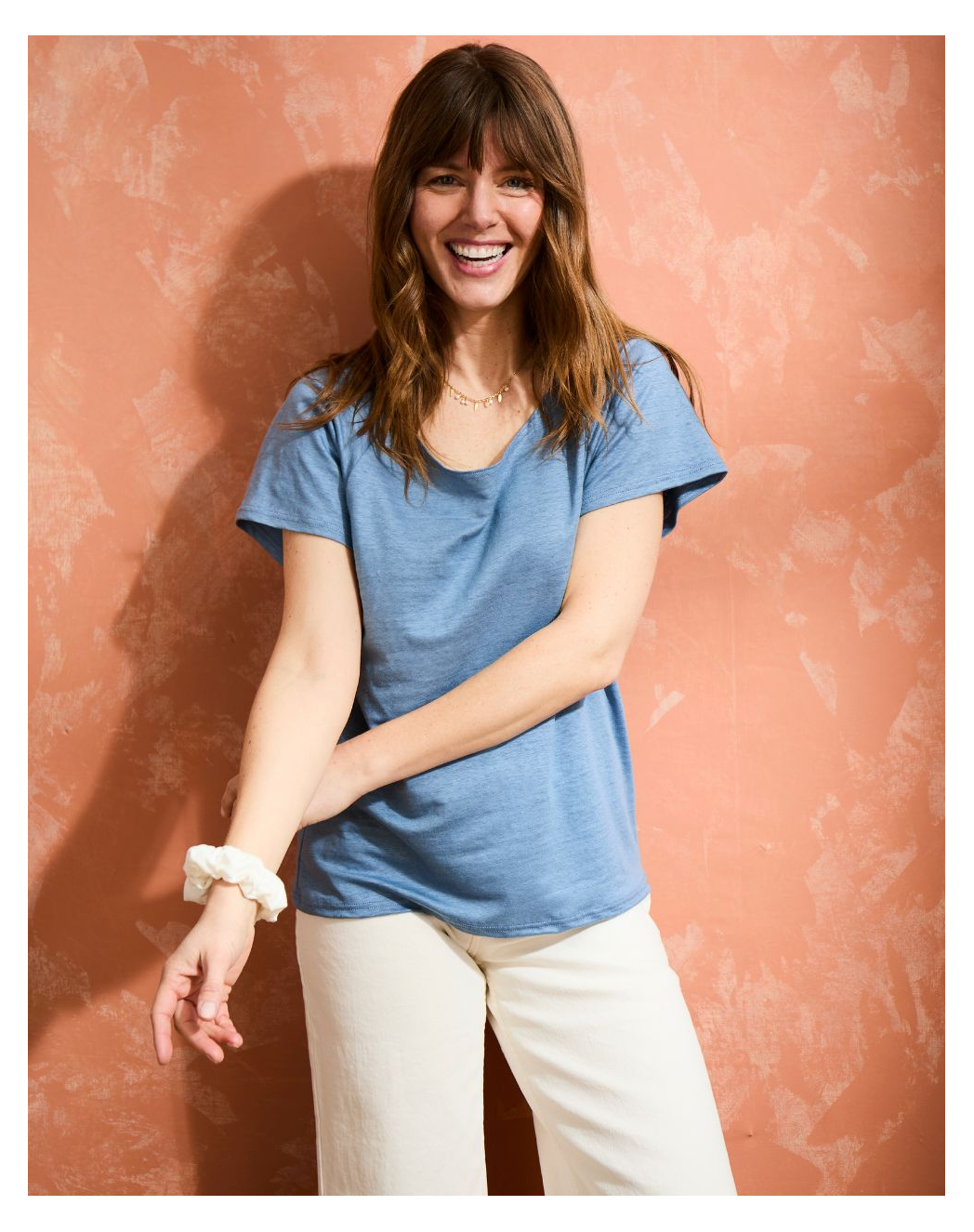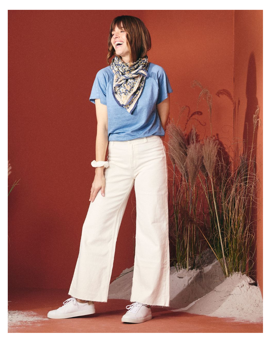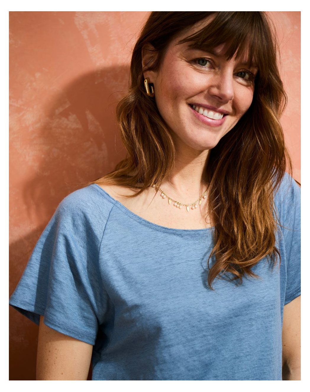 Ce t-shirt en lin, à la coupe fluide et au col rond subtilement décolleté, joue sur l’équilibre parfait entre décontraction et féminité. Son jersey de lin épais offre une tenue impeccable tout en restant léger et respirant. Dans une nuance bleuet, délicate et lumineuse, il apporte une touche de fraîcheur et de douceur au vestiaire. Une pièce intemporelle, pensée pour accompagner chaque saison avec élégance
