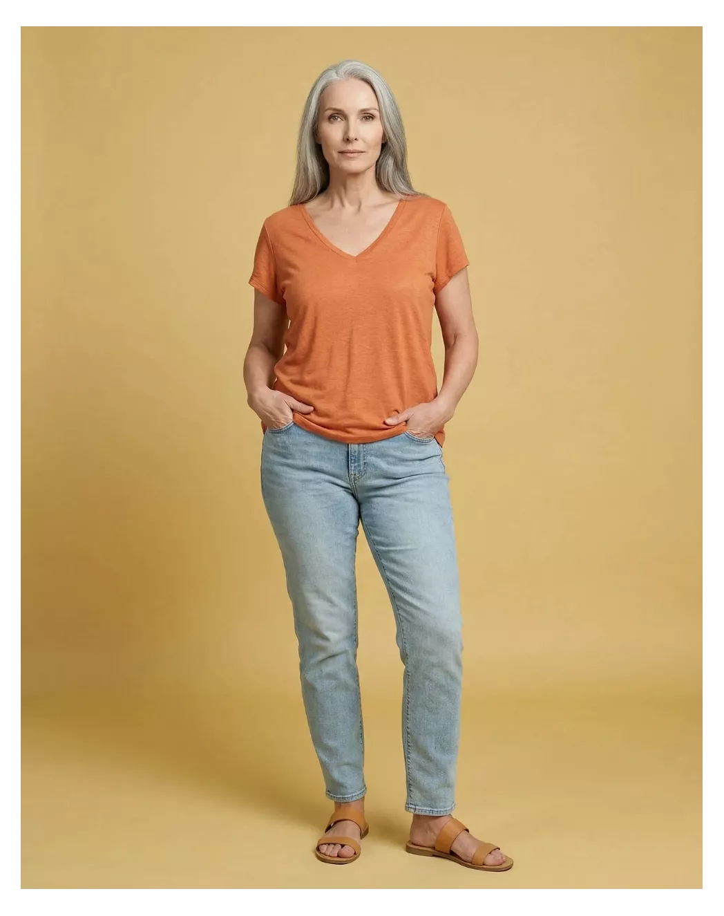 Alina a été pensée pour exprimer tout le potentiel du lin 230 grammes dans un t-shirt d’été à la fois simple et structuré. Son jersey dense mais souple crée un drapé naturel qui équilibre la silhouette, tandis que le col V et la coupe droite apportent une ligne nette et facile à porter. Le coloris orange réchauffe la matière et illumine le visage, donnant au modèle une présence solaire sans perdre sa sobriété. Sur le corps, le lin reste respirant et confortable, faisant d’Alina une pièce fiable que l’on retrouve saison après saison.