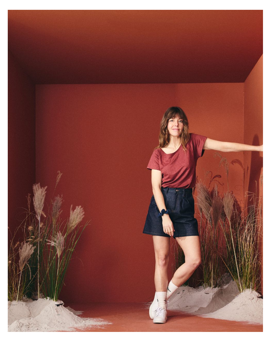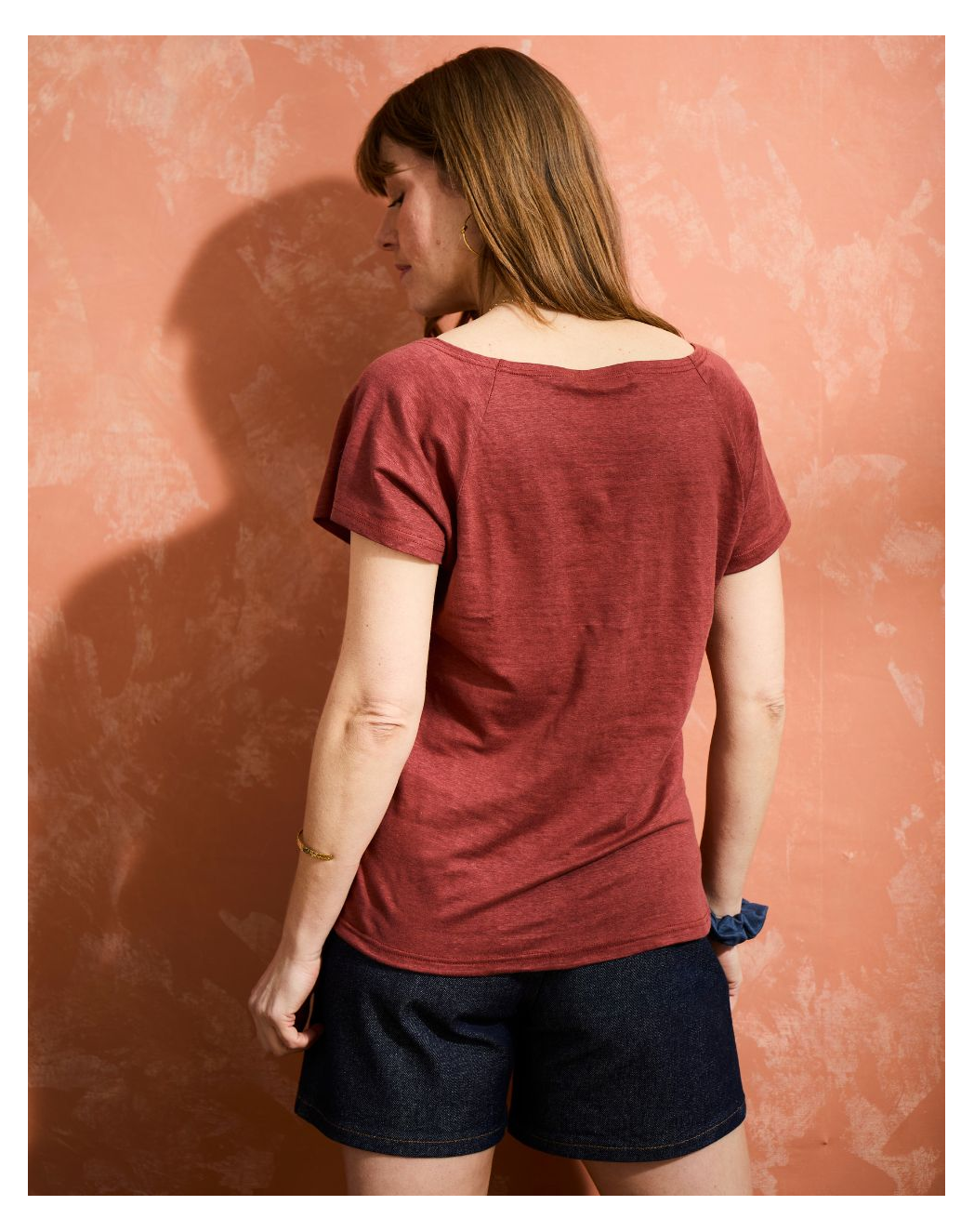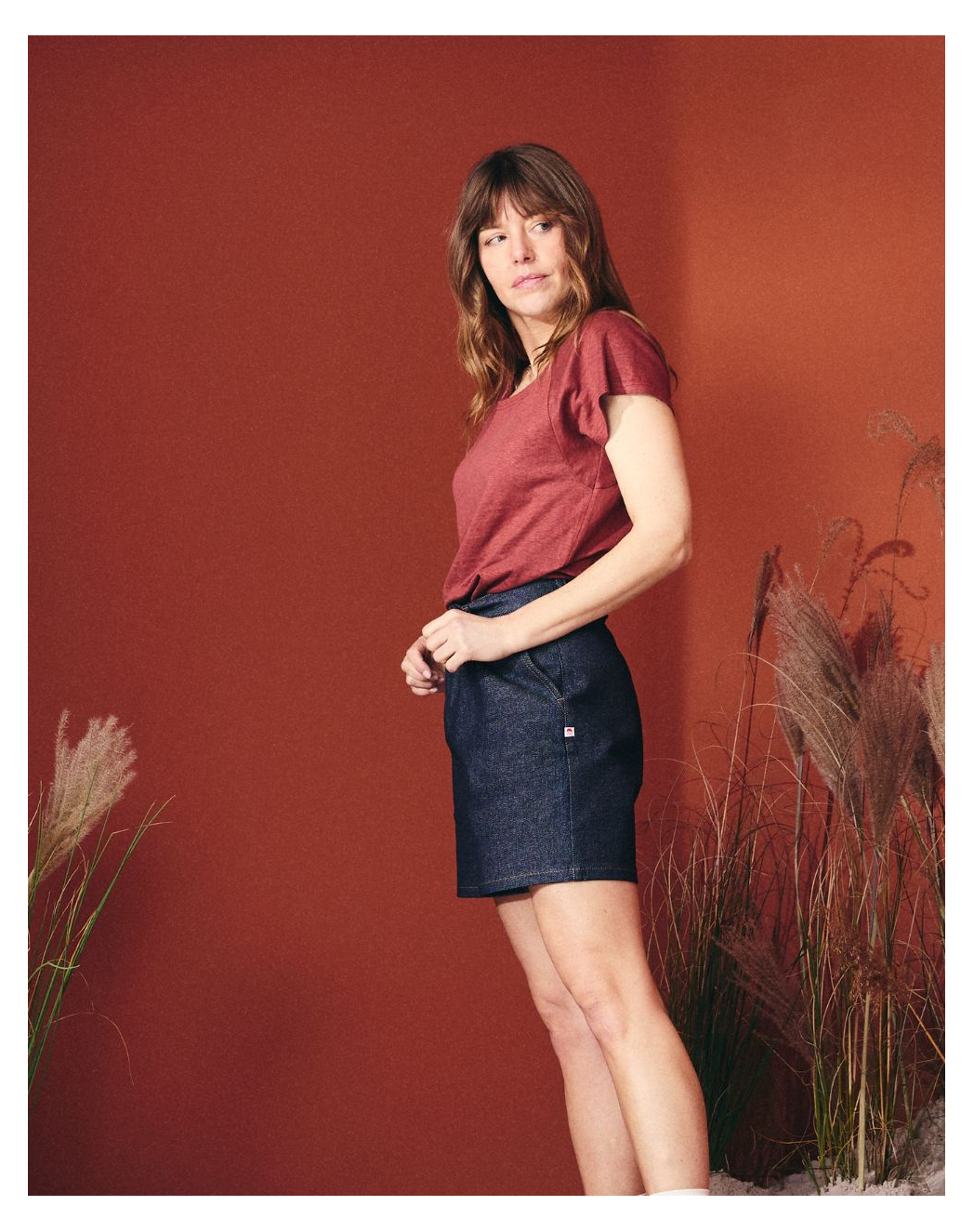 Un col rond qui effleure le cou, une coupe fluide qui danse sur la peau, et cette teinte terracotta, profonde et solaire, qui réchauffe instantanément le teint. Alina, c’est ce t-shirt en lin 100% français que l’on enfile sans y penser, mais qui change tout. Son tombé naturel suit chaque mouvement avec grâce, tandis que sa matière légère et respirante accompagne les journées en toute sérénité. Porté avec un denim brut pour un contraste saisissant ou glissé sous une veste, il traverse les saisons avec une élégance désinvolte.