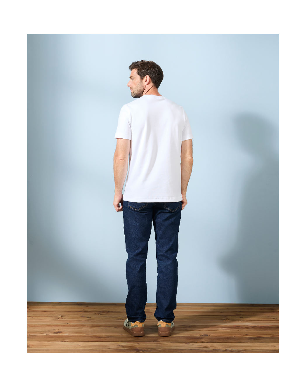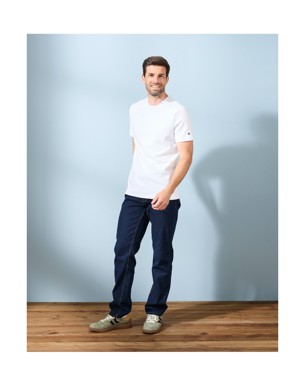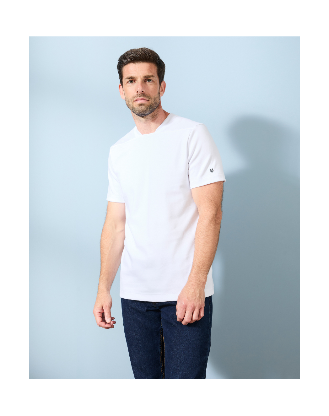 Notre intention avec ce modèle ? Réinventer le t-shirt homme classique. Nous avons conservé la base du t-shirt Robin : une coupe droite et une maille interlock 100 % coton, dense et premium, pour un tombé et un toucher impeccables. Mais nous avons laissé de côté le col rond traditionnel, au profit d’une encolure retravaillé en côte 1x1 et d’une découpe droite qui souligne la carrure et attire immédiatement le regard. Résultat : une pièce qui se démarque instantanément, pensée pour ne laisser personne indifférent.