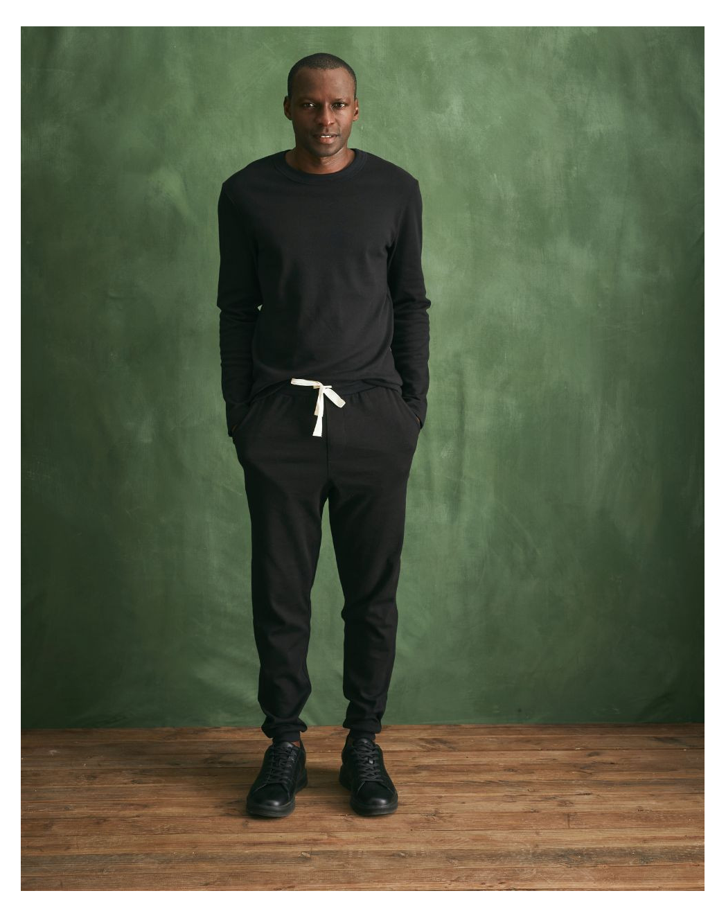 Notre mannequin Ezekiek mesure 1.86m et porte une taille L pour le t-shirt et M pour le Jogging